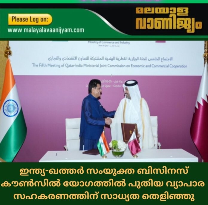 ദോഹ :-ഇന്ത്യ-ഖത്തർ സംയുക്ത ബിസിനസ് കൗൺസിൽ യോഗ ത്തിൽ പുതിയ വ്യാപാരസഹകരണ ത്തിന് സാധ്യത തെളിഞ്ഞു. ഇന്ത്യയും ഖത്തറും തമ്മിലുള്ള വാണിജ്യ-വ്യവസായ ബന്ധങ്ങൾ ശക്തിപ്പെടുത്തുന്നതിനുള്ള ചർച്ചകൾക്ക് വേദിയായി ഇന്ത്യ-ഖത്തർ സംയുക്ത ബിസിനസ് കൗൺസിൽ (IJBC) യോഗത്തിൽ ഇരു രാജ്യങ്ങളുടെയും വാണിജ്യ-വ്യവസായ മന്ത്രിമാർ യോഗത്തിൽ പങ്കെടുത്തതോടെയാണ് പുതിയ വ്യാപാര സഹകരണങ്ങൾക്ക് സാധ്യത തെളിഞ്ഞത്.