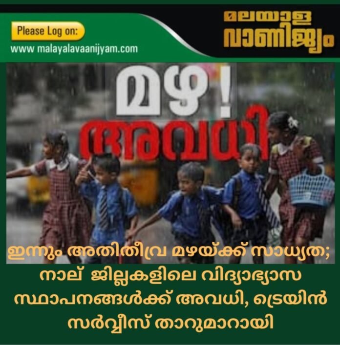 തിരുവനന്തപുരം :-ഇന്നും അതിതീ വ്ര മഴയ്ക്ക് സാധ്യത; നാല് ജില്ലക ളിലെ വിദ്യാഭ്യാസ സ്ഥാപനങ്ങൾക്ക് അവധി, ട്രെയിൻ സർവ്വീസ് താറുമാ റായി.കേരളത്തിൽ അതിശക്തമായ മഴ തുടരുകയാണ്. മൂന്ന് ജില്ലകളിൽ ഇന്ന് റെഡ് അലർട്ടാണ്. കോഴിക്കോട്, വയനാട്, കണ്ണൂർ ജില്ലകളിലാണ് റെഡ് അലർട്ട്. തൃശ്ശൂർ, മലപ്പുറം, കാസർകോട് ജില്ലകളിൽ ഓറഞ്ച് അലർട്ടും, മറ്റ് ജില്ലകളിൽ യെല്ലോ അലർട്ടും പ്രഖ്യാപിച്ചിട്ടുണ്ട്. അതിശക്തമായ മഴ തുടരുന്ന സാഹചര്യത്തിൽ കണ്ണൂർ, വയനാട്, കോട്ടയം, കോഴിക്കോട് ജില്ലകളിലെ വിദ്യാഭ്യാസ സ്ഥാപനങ്ങൾക്ക് ഇന്ന് അവധി നൽകിയിട്ടുണ്ട്. ബംഗാൾ ഉൾക്കടലിന് മുകളിലായി ഇന്ന് മറ്റൊരു ന്യൂനമർദ്ദം കൂടി രൂപപ്പെടാൻ സാധ്യതയുള്ളതിനാൽ കേരളത്തിൽ അടുത്ത അഞ്ച് ദിവസം വ്യാപകമായ മഴയ്ക്ക് സാധ്യതയുണ്ടെന്നാണ് കേന്ദ്ര കാലാവസ്ഥാ വകുപ്പിന്റെ മുന്നറിയിപ്പ്. കേരള, ലക്ഷദ്വീപ് തീരങ്ങളിൽ മത്സ്യബന്ധനത്തിന് വിലക്കുണ്ട്. കേരള തീരത്ത് കള്ളക്കടൽ മുന്നറിയിപ്പും പുറപ്പെടുവിച്ചിട്ടുണ്ട്. . ഇന്ന് മധ്യ പടിഞ്ഞാറൻ – വടക്കൻ ബംഗാൾ ഉൾക്കടലിനു മുകളിലായി മറ്റൊരു ന്യുനമർദ്ദം കൂടി രൂപപ്പെടാൻ സാധ്യതയുണ്ട്. കേരളത്തിൽ അടുത്ത അഞ്ച് ദിവസം വ്യാപകമായ മഴയ്ക്ക് സാധ്യതയുണ്ട്. തിരുവനന്തപുരം, കൊല്ലം, പത്തനംതിട്ട, ആലപ്പുഴ, കോട്ടയം, എറണാകുളം, ഇടുക്കി, പാലക്കാട് എന്നീ ജില്ലകളിലാണ് ഇന്ന് യെല്ലോ അലർട്ടുള്ളത്. സംസ്ഥാനത്ത് മഴക്കെടുതി രൂക്ഷമാണ്.കോഴിക്കോടും ആലുവയിലും കനത്ത മഴയെ തുടർന്ന് റെയിൽവേ ട്രാക്കിലേക്ക് മരം കടപുഴകി വീണു. കോഴിക്കോട് അരീക്കാടുണ്ടായ ചുഴലിക്കാറ്റിൽ റെയിൽവേ ട്രാക്കിലേക്ക് മൂന്നു മരങ്ങൾ കടപുഴകി വീണു. വീടിന്റെ മേൽക്കൂര റെയിൽവേ ട്രാക്കിലേക്ക് പറന്നുവീണു. റെയിൽവേ ട്രാക്കിന്റെ വൈദ്യുതി ലൈൻ ഉൾപ്പെടെ കാറ്റിൽ തകർന്നു. അപകടത്തെ തുടർന്ന് ട്രെയിൻ സർവീസുകൾ താറുമാറായി.